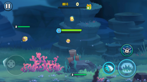 游戏中有一个摇杆控制小鱼的移动,另一侧是进食按钮、加速按钮和技能按钮。玩家需要控制小鱼在海洋中游动,寻找可食用的小鱼。随着不断吃掉更多的小鱼,玩家的小鱼会逐渐成长并变得更加强壮,不同大小和种类的小鱼提供的经验值和营养价值不同,需要根据自身实力和状态选择吃掉哪些小鱼,以便最大化自身的收益,遇到等级高的鱼类会在界面显示红色感叹号提示。